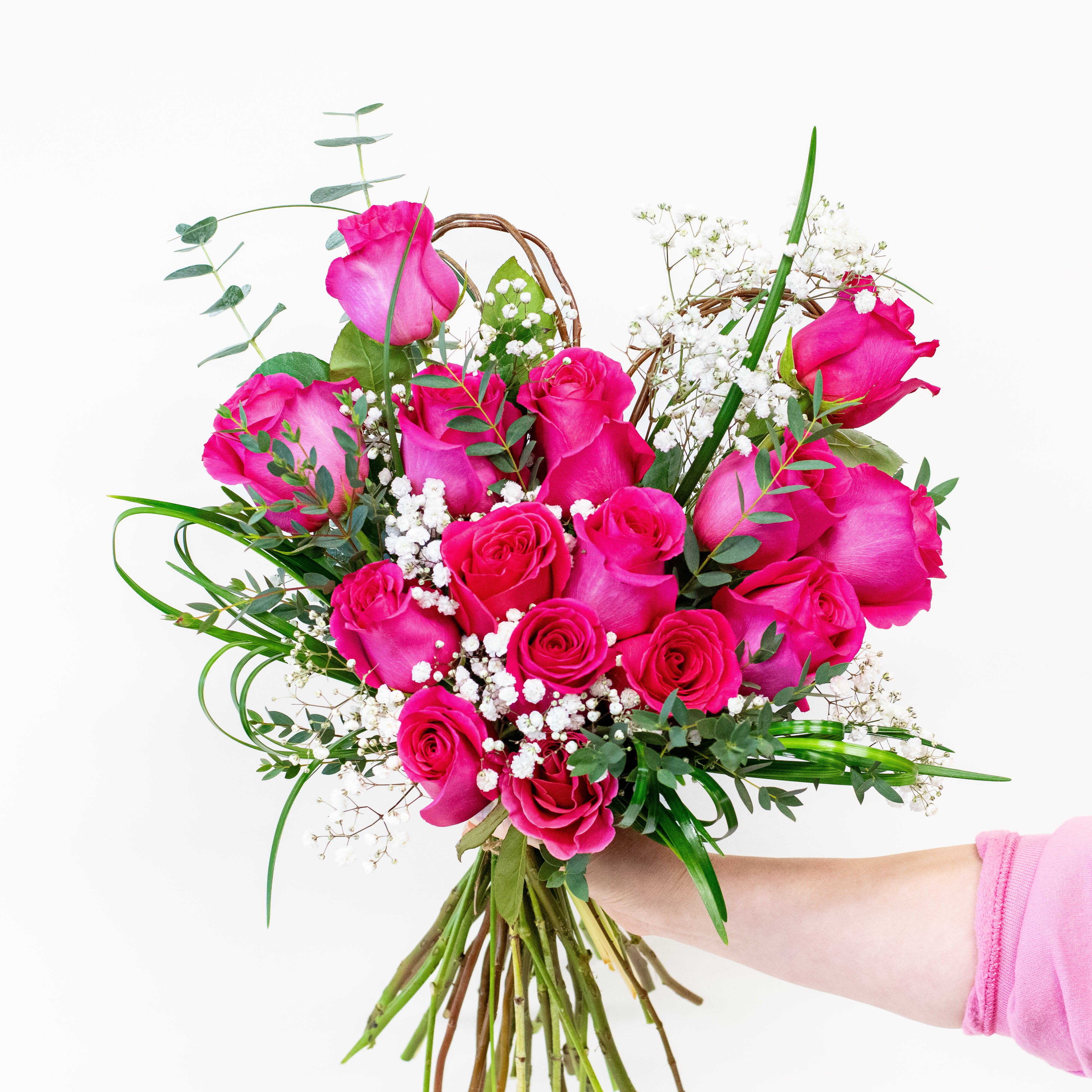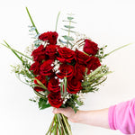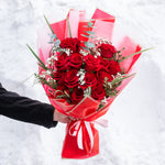 This Valentine's Day, elevate your expression of love with a stunning gift of 15 exquisite roses, artfully arranged in a romantic heart shape. Nestled together, this hand-tied bouquet is elegantly wrapped in beautiful paper, adding a touch of sophistication and charm. This breathtaking arrangement is not just a gift; it's a heartfelt gesture that is sure to captivate and impress your special someone.