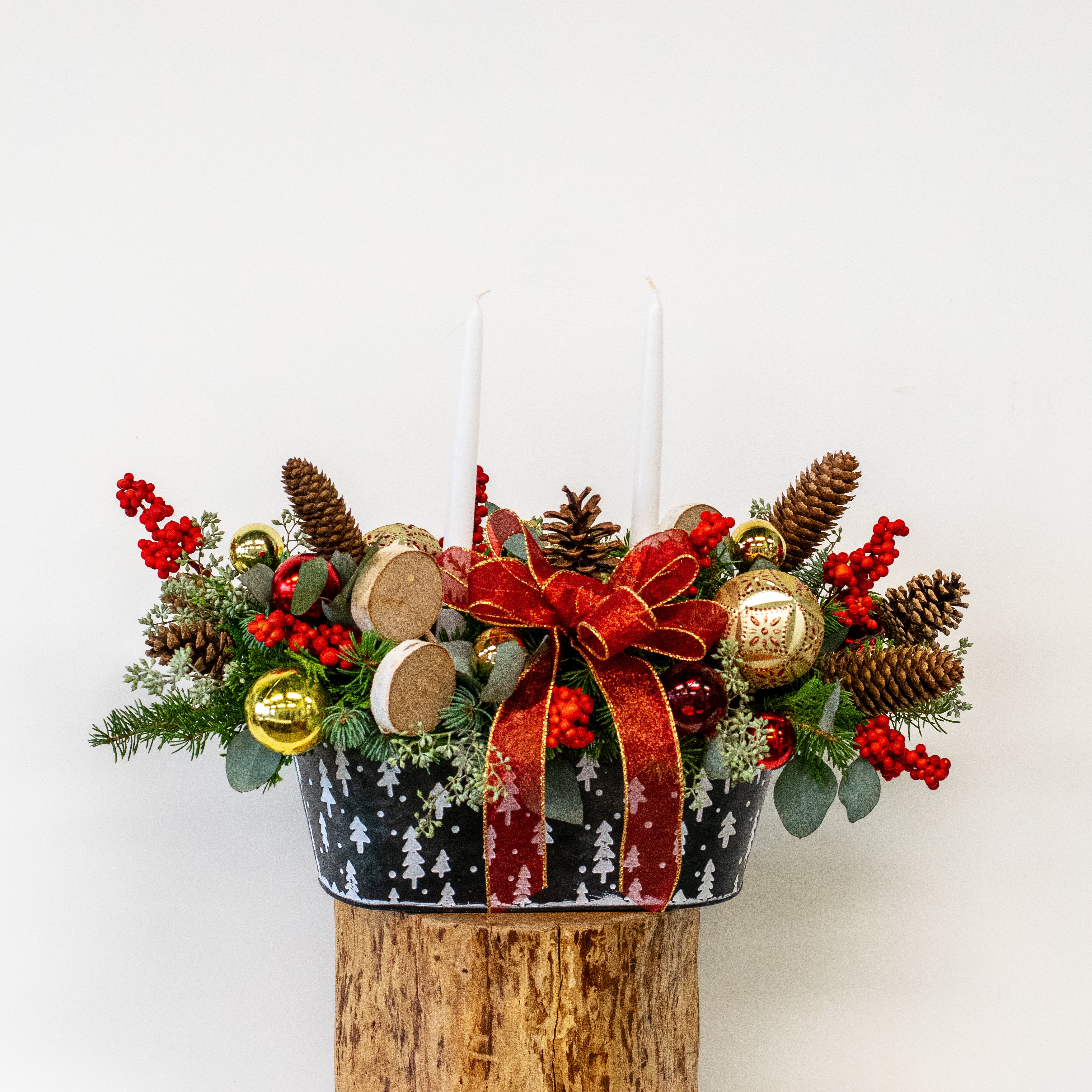 Looking for a way to bring some holiday cheer into your home or brighten someone's day? A festive arrangement is the perfect choice! This design features only red & gold colours.