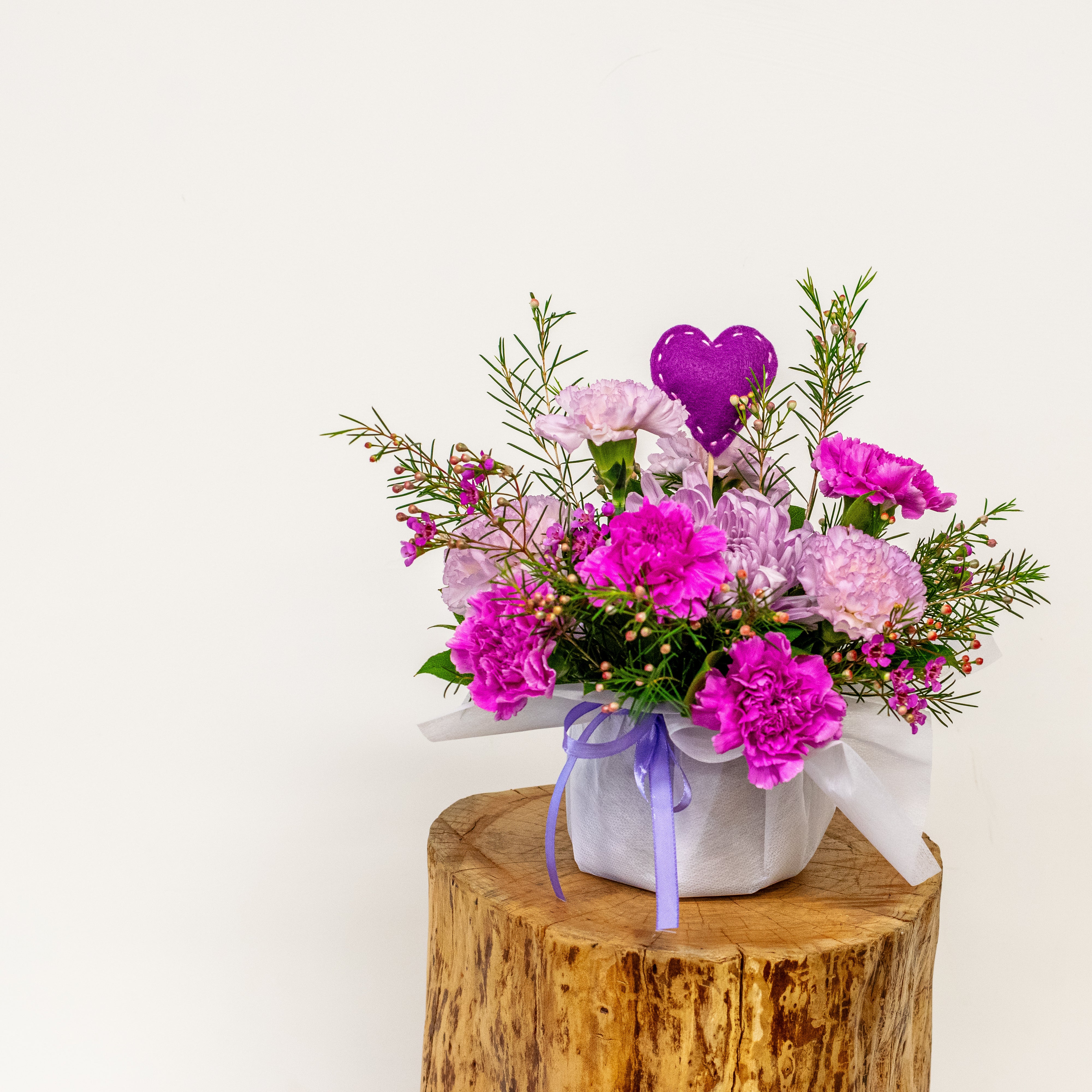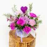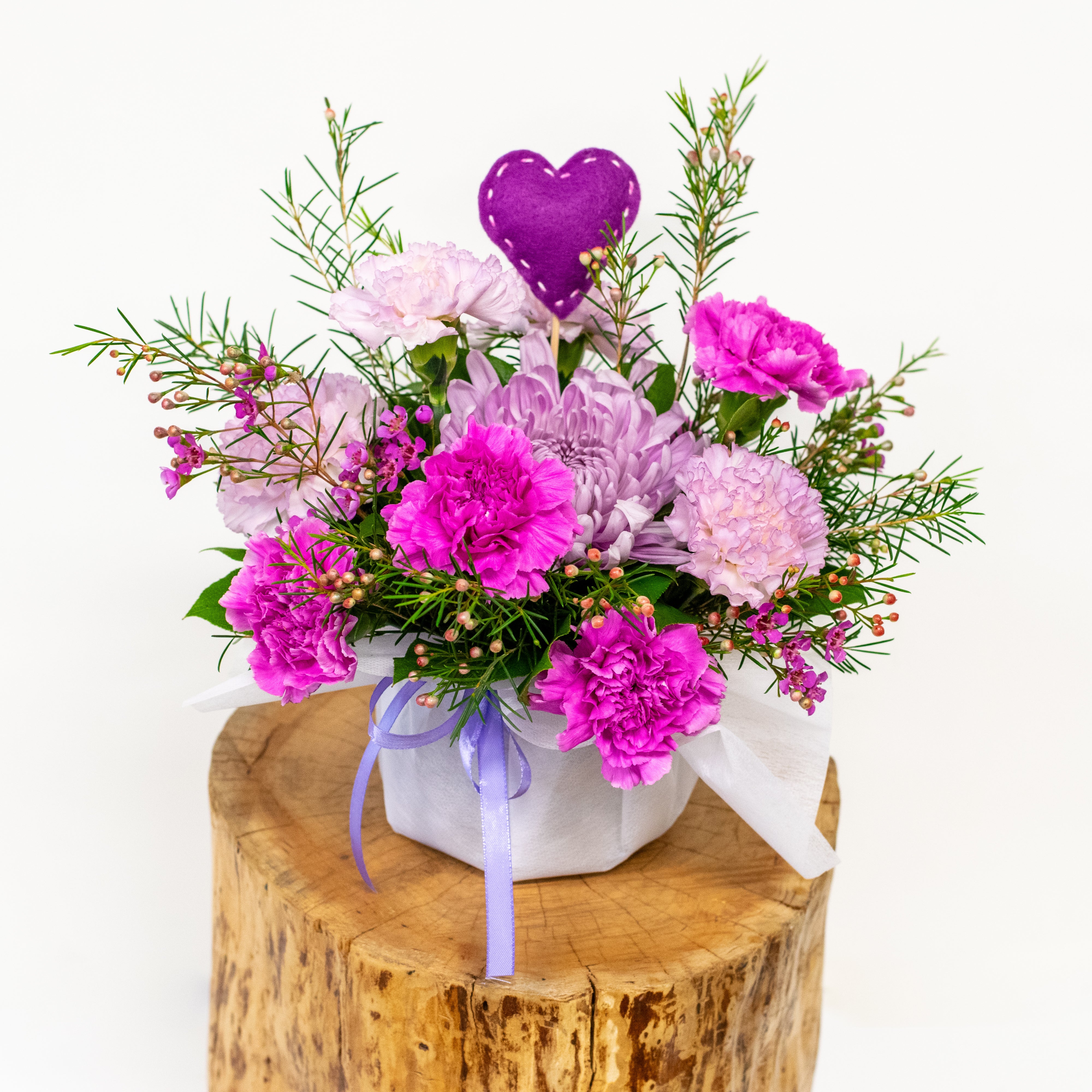 If you're searching for a low and artistic floral arrangement, your search ends here! It features a lovely mix of purple and lavender carnations, along with filler and greenery. This thoughtful gift is perfect for that special someone in your life.