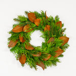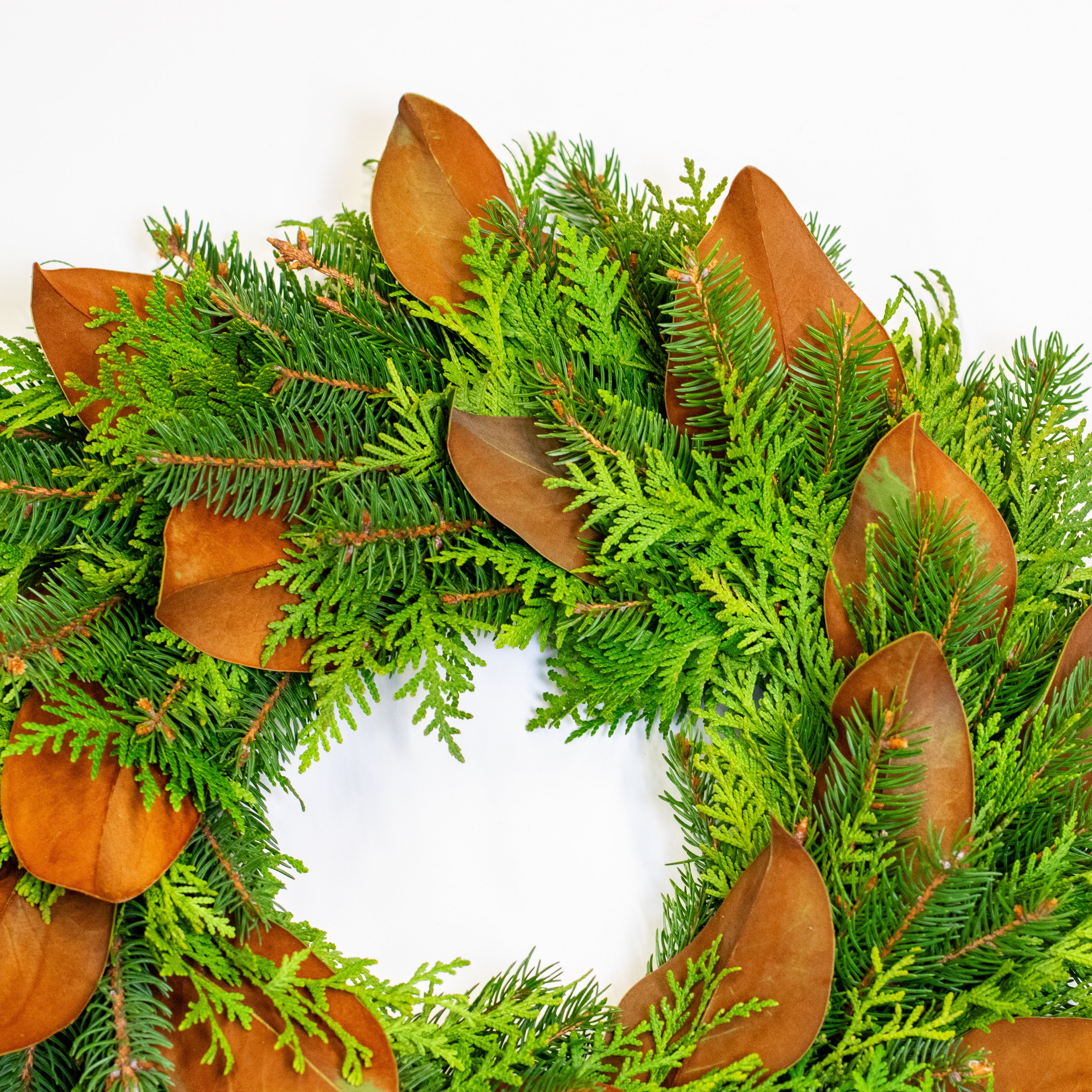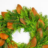 Looking to elevate your front door decor just in time for the holiday season? Look no further! This stunning handmade wreath is the ideal choice to add a festive touch! Bursting with a gorgeous blend of fir, cedar, and magnolia leaves, it's sure to wow your guests and bring holiday cheer to your home!