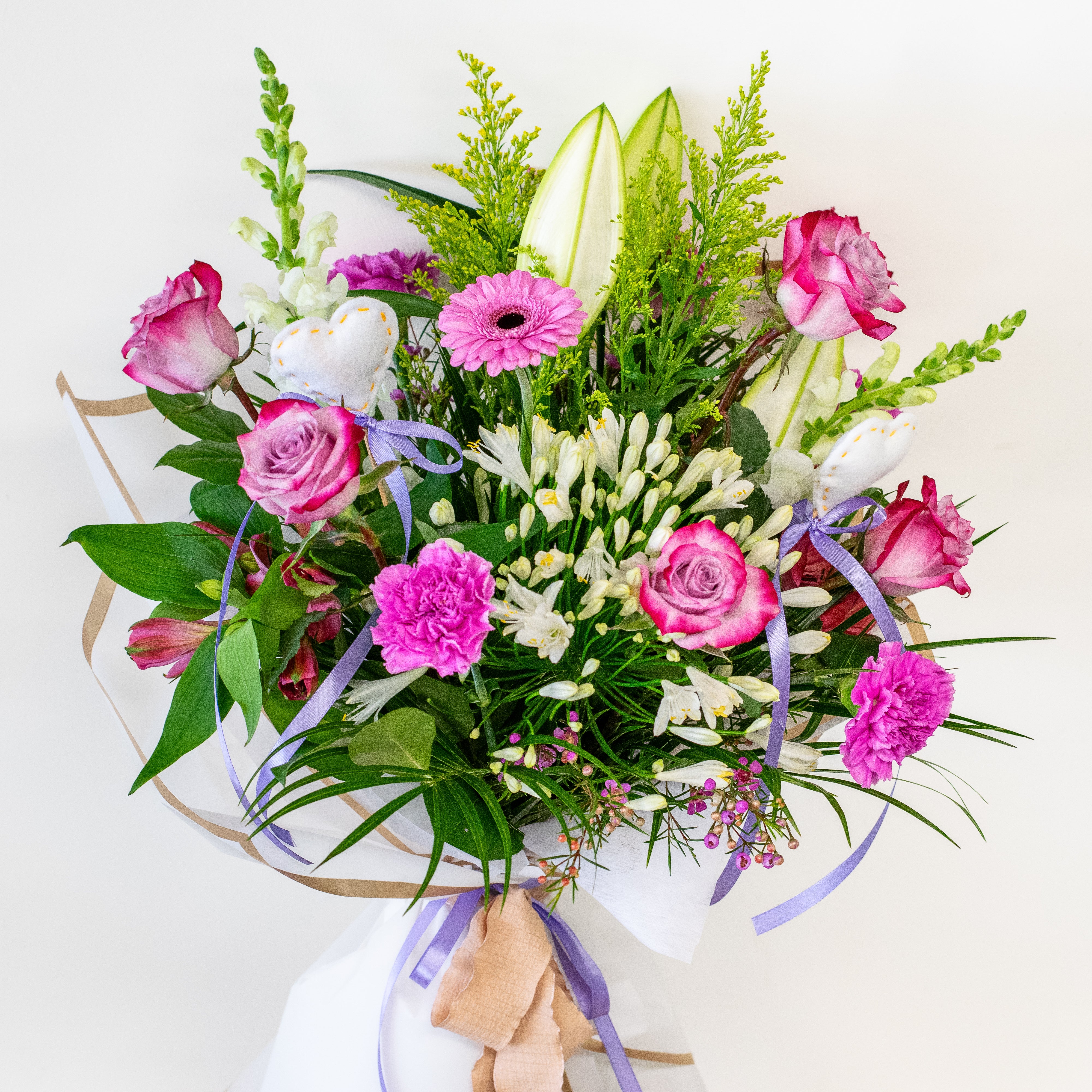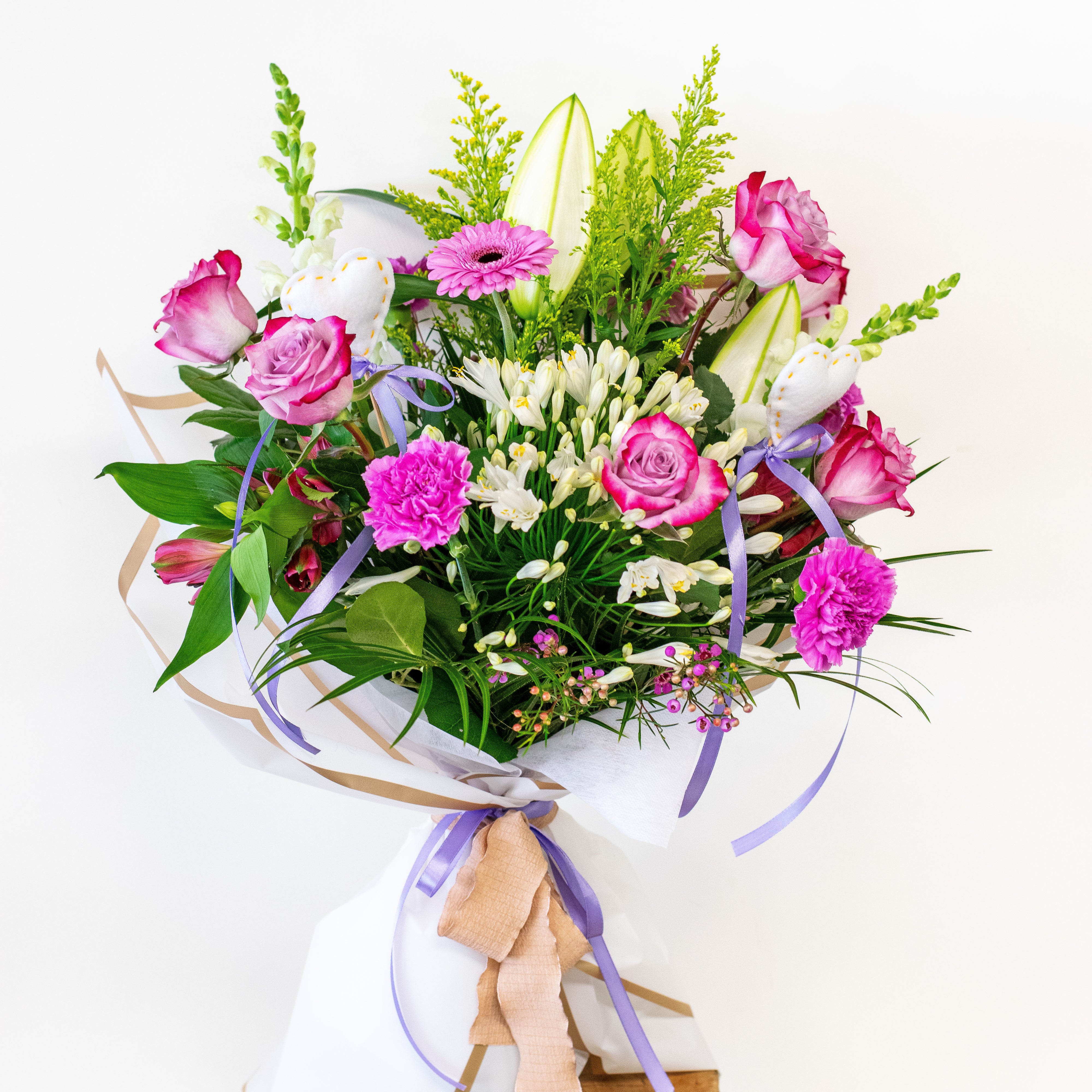 This Valentine's Day, elevate your expression of love with a stunning bouquet of white and lavender flowers. This hand-tied bouquet is elegantly wrapped in beautiful paper, adding a touch of sophistication and charm. This breathtaking arrangement is not just a gift; it's a heartfelt gesture that is sure to captivate and impress your special someone.