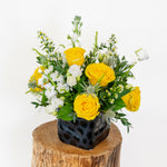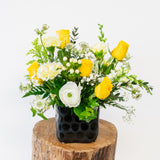 If you're searching for a low and artistic floral arrangement, your search ends here! It features a lovely mix of white and yellow flowers and vibrant greenery. This thoughtful gift is perfect for that special someone in your life.