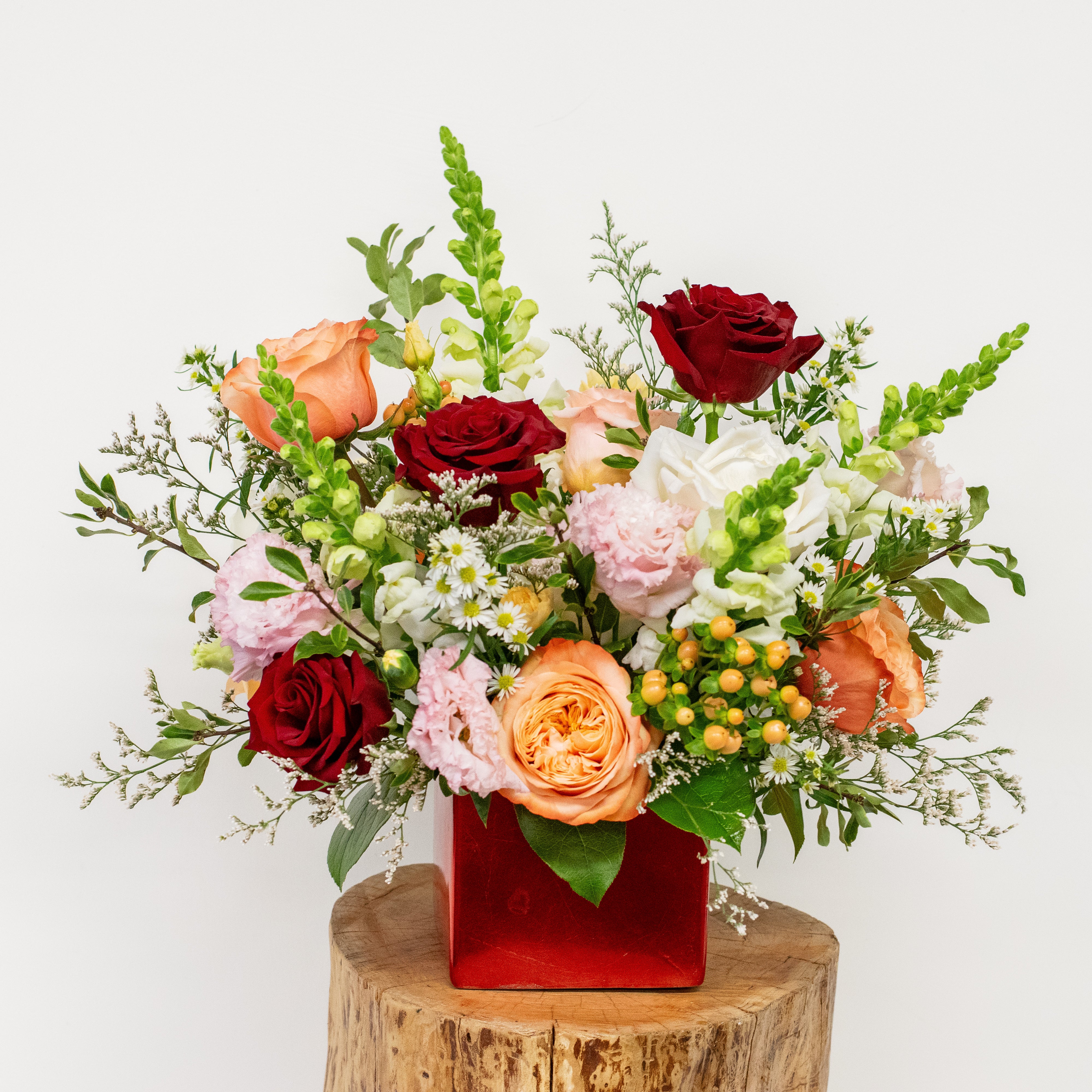 If you're searching for a low and garden-style floral arrangement, your search ends here! It features a lovely mix of white, pink, red, and peach flowers and vibrant greenery. This thoughtful gift is perfect for that special someone in your life.