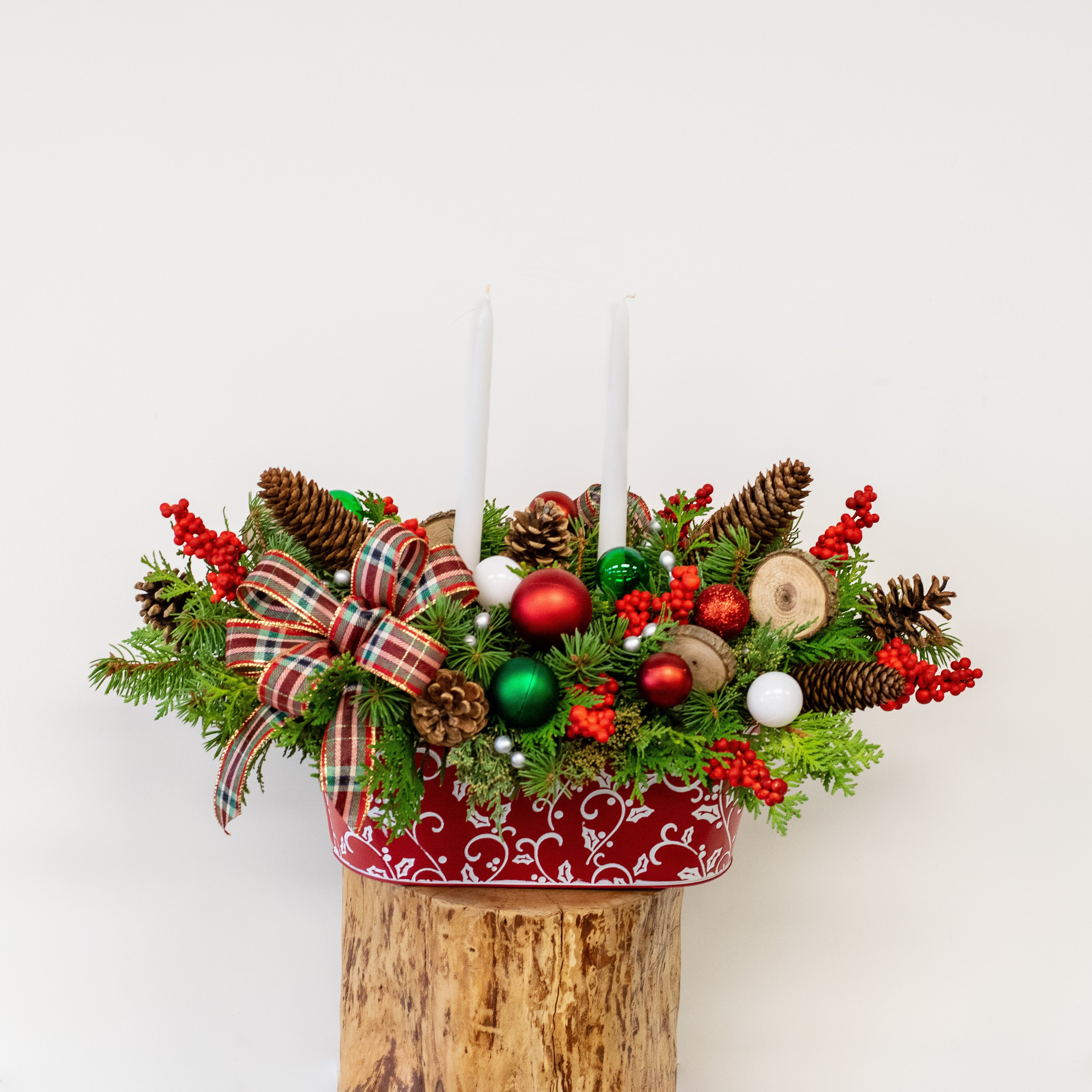 Looking for a way to bring some holiday cheer into your home or brighten someone's day? A festive arrangement is the perfect choice! This design features only red, green & white colours.